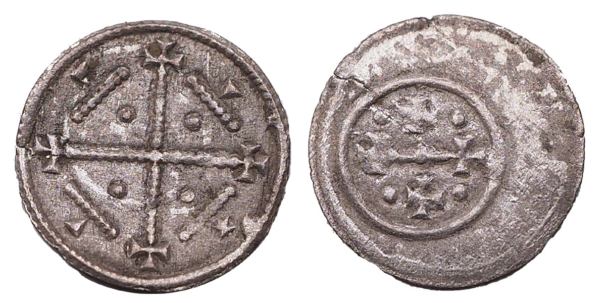 Leírás: Ag denár, csillag sziglával, ami ennél a típusnál rendkívül ritka. Mindössze egy publikált változat ismert, ezen a példányon pedig a csillag elhelyezkedése máshol van, jelenleg publikálatlan! 0.21gElõlap: Hátlap: Referencia: Opitz - /20.9.1.72/ éh 72, Huszár 152 Tartásfok: