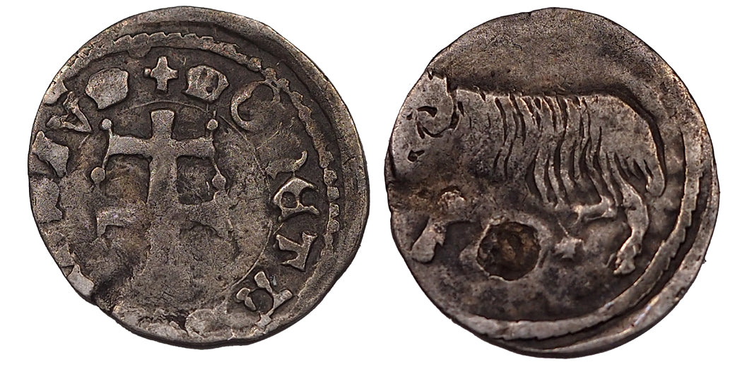 Leírás: Ag denár, Buda város verete, 1336-1338 között, 0.35gElõlap: bárány balra haladHátlap: kettõskeresztReferencia: Pohl 103, Huszár 504 Tartásfok: