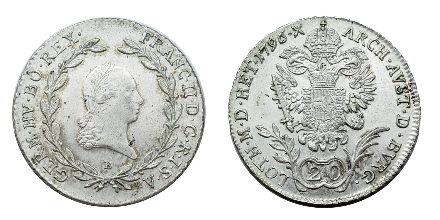 Leírás:Ag 20 krajcár 1796 B, 6.64gElõlap: Hátlap: Referencia:Éh 1375a, Huszár 1964 Tartásfok:EF-gEF
