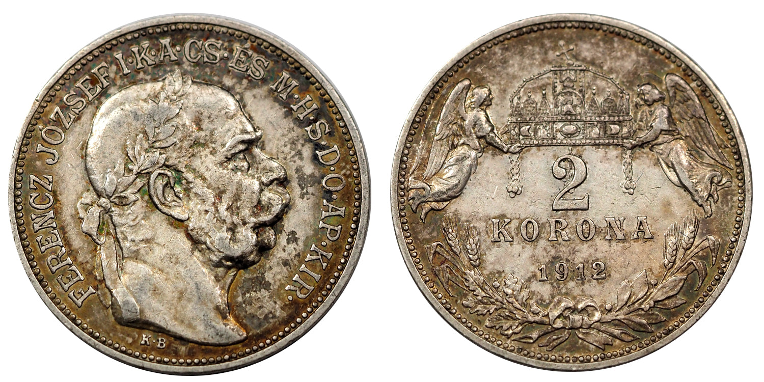Leírás:Ag 2 korona 1912 KB, 9.98gElõlap: Hátlap: Referencia:Éh 1494, Huszár 2202 Tartásfok:gEF, patina