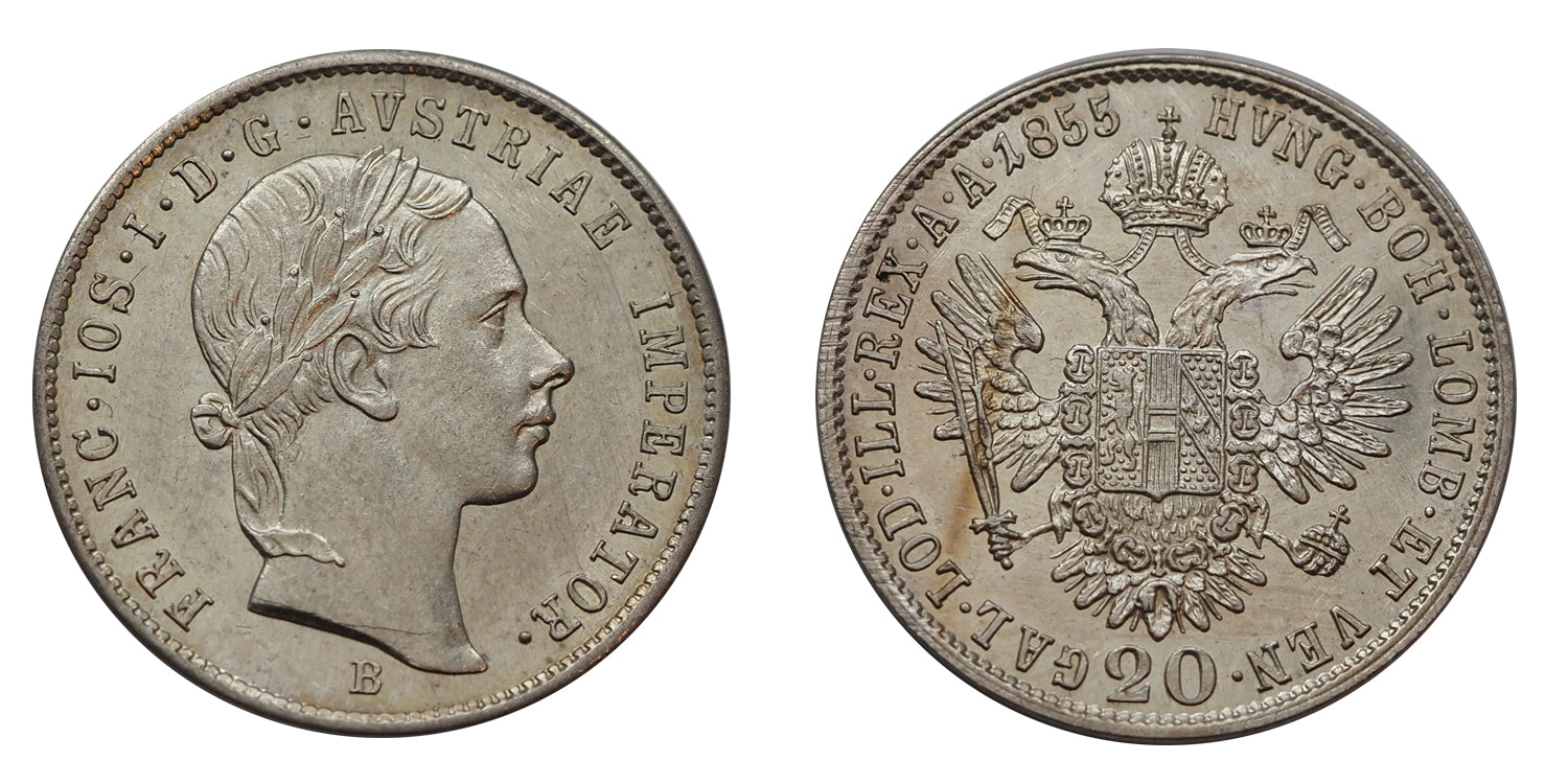 Leírás:Ag 20 krajcár 1855 B- Körmöcbánya, 4.29gElõlap:mellkép jobbraHátlap:címerReferencia:Éh 1443a, Huszár 2148 Tartásfok:UNC, verdefény
