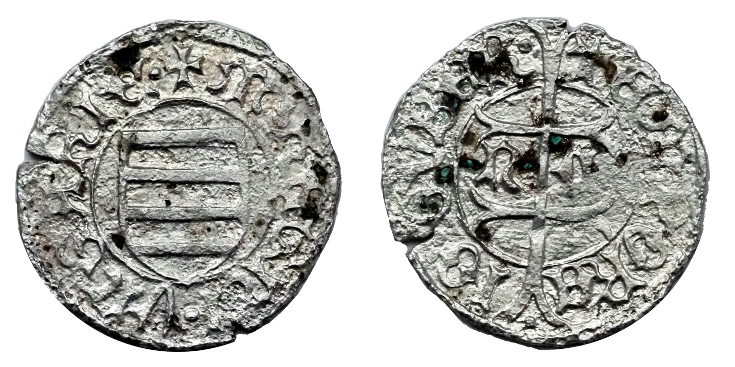 Leírás:Ag denár, n-C Nagybánya, 1446-ból, 0.57gElõlap: Hátlap: Referencia:Éh 485q, Huszár 618, Pohl 175-7 Tartásfok:EF