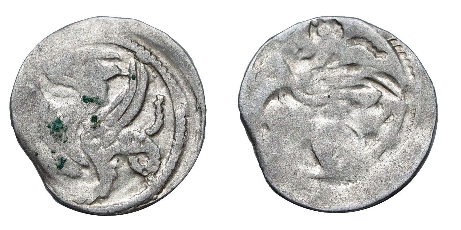 Leírás:Ag incuse denár,0.62gElõlap:hátlap negatív képeHátlap:sárkány balraReferencia:Op. 22.45.1.1, éh 300, Huszár 390 Tartásfok:EF