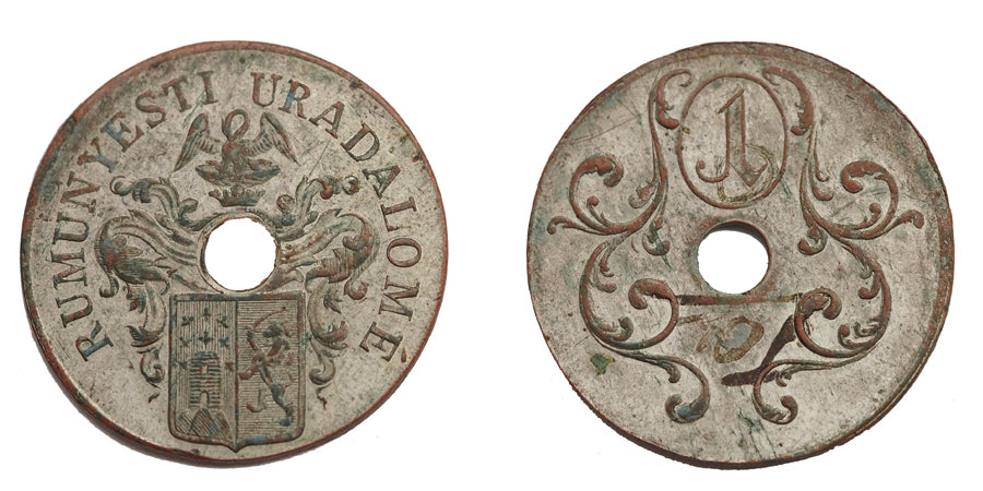 Leírás: Ezüstözött sárgaréz 1-es címletû bárca, 1833-ból. Rumunyest Krssó-Szörény vármegyében a Béga egyik mellékfolyója mentén fekszik. Fábry János királyi adományként kapta Rumunyest falut, ahol uraldamat létesített. Az itt végzett robotmunkák igazolására adott ki négy különbözõ címletû bárcát. Ez 3/4-es értékjelzésû. Nagyon ritka! 5.66 gElõlap: RUMUNYESTI URADALOMÉ, középen a Fábry-család címereHátlap: barokkos indadíszben 1Referencia: Zombori KS III.4Tartásfok: UNC