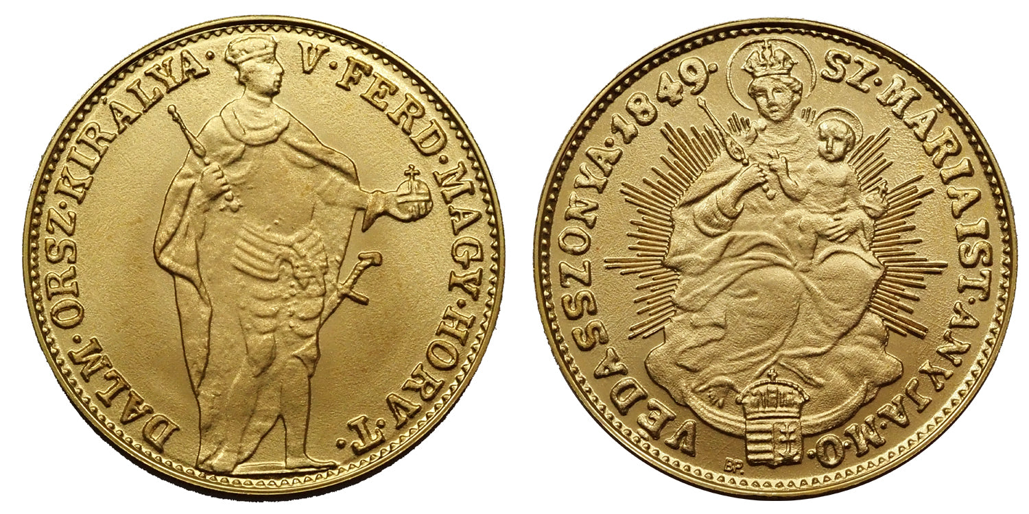 Leírás:Au /986/ dukát 1849 up. Állami Pénzverõ. 1849-es dukátok nem készültek a szabadságharc alatt, de a verõszerszámok elkészültek. Ezek felhasználásával készült 150 példány 2022-ben a Magyar Pénzverõben. Díszdoboz, certifikát jár hozzá. Sorszámozott, ez a 25-ös példány. 3.50gElõlap: Hátlap: Referencia: Tartásfok:BU